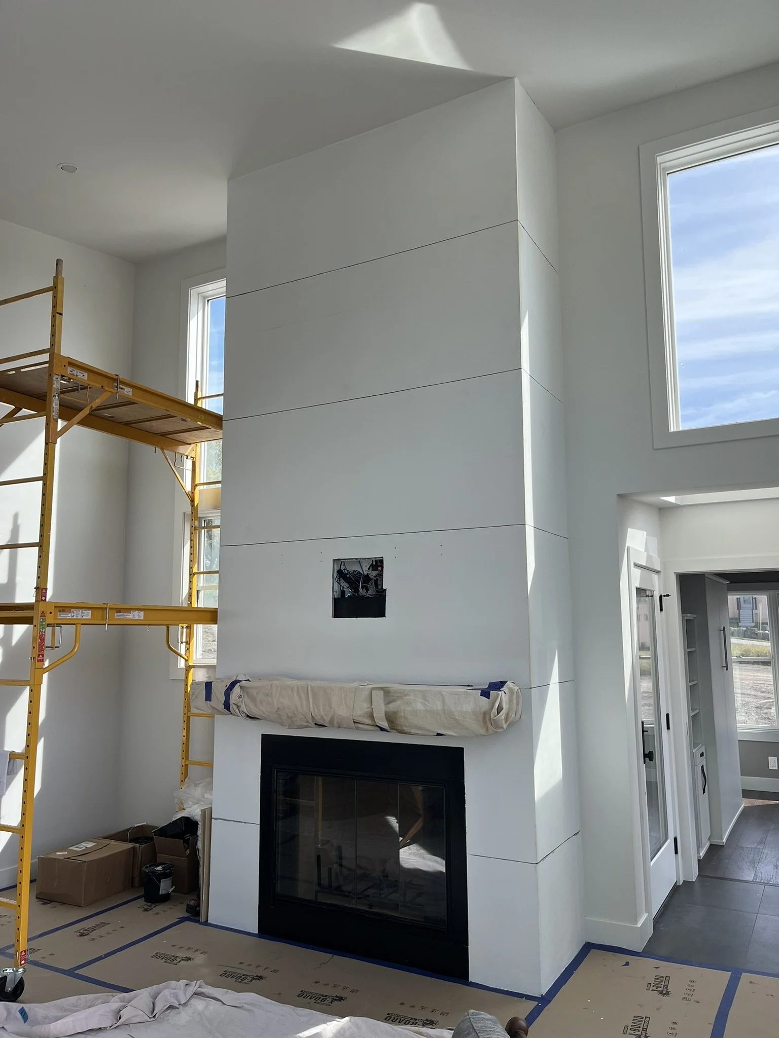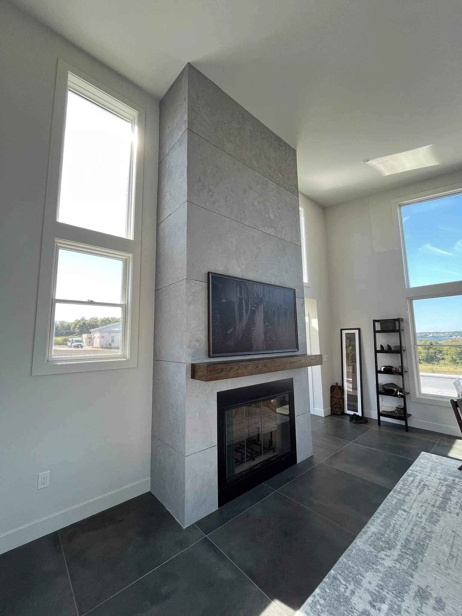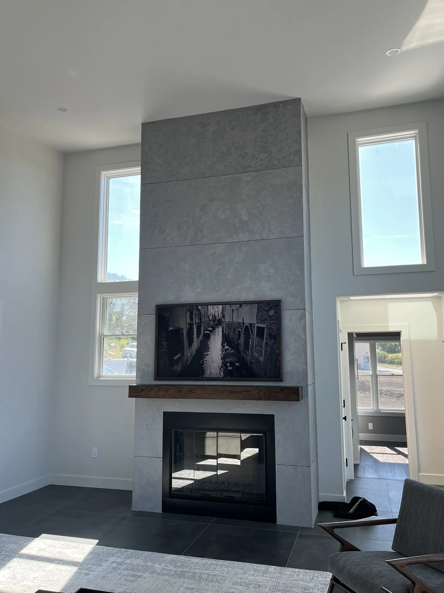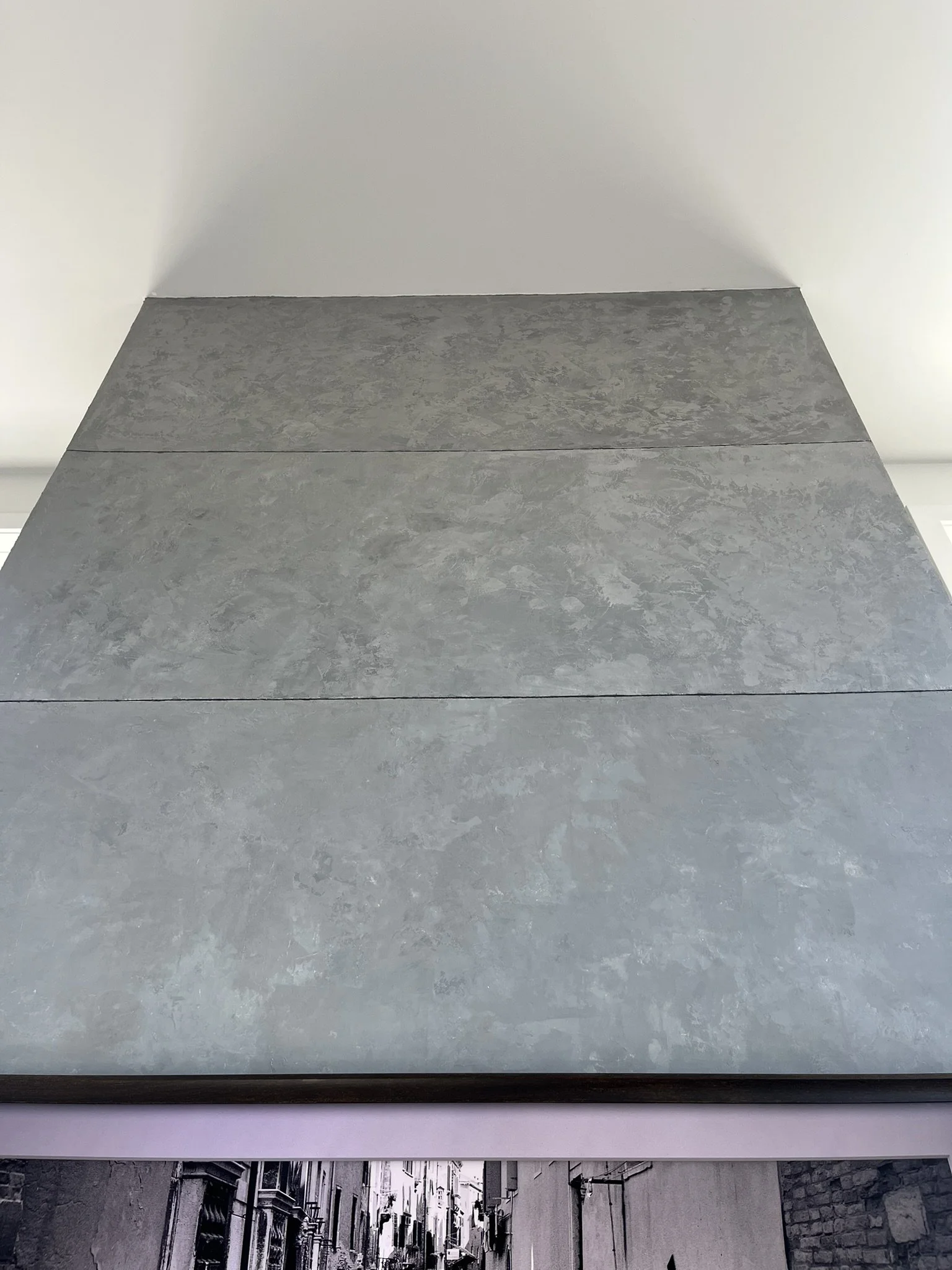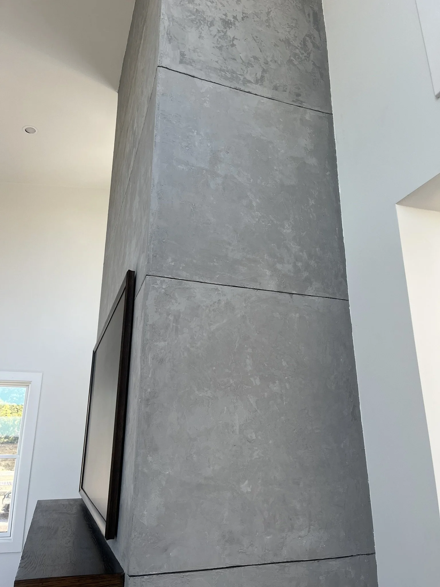 This Faux Concrete finish is a decorative plaster that can be applied in various ways achieve different variations of concrete. This client chose a broken textured look for their living room aesthetic.